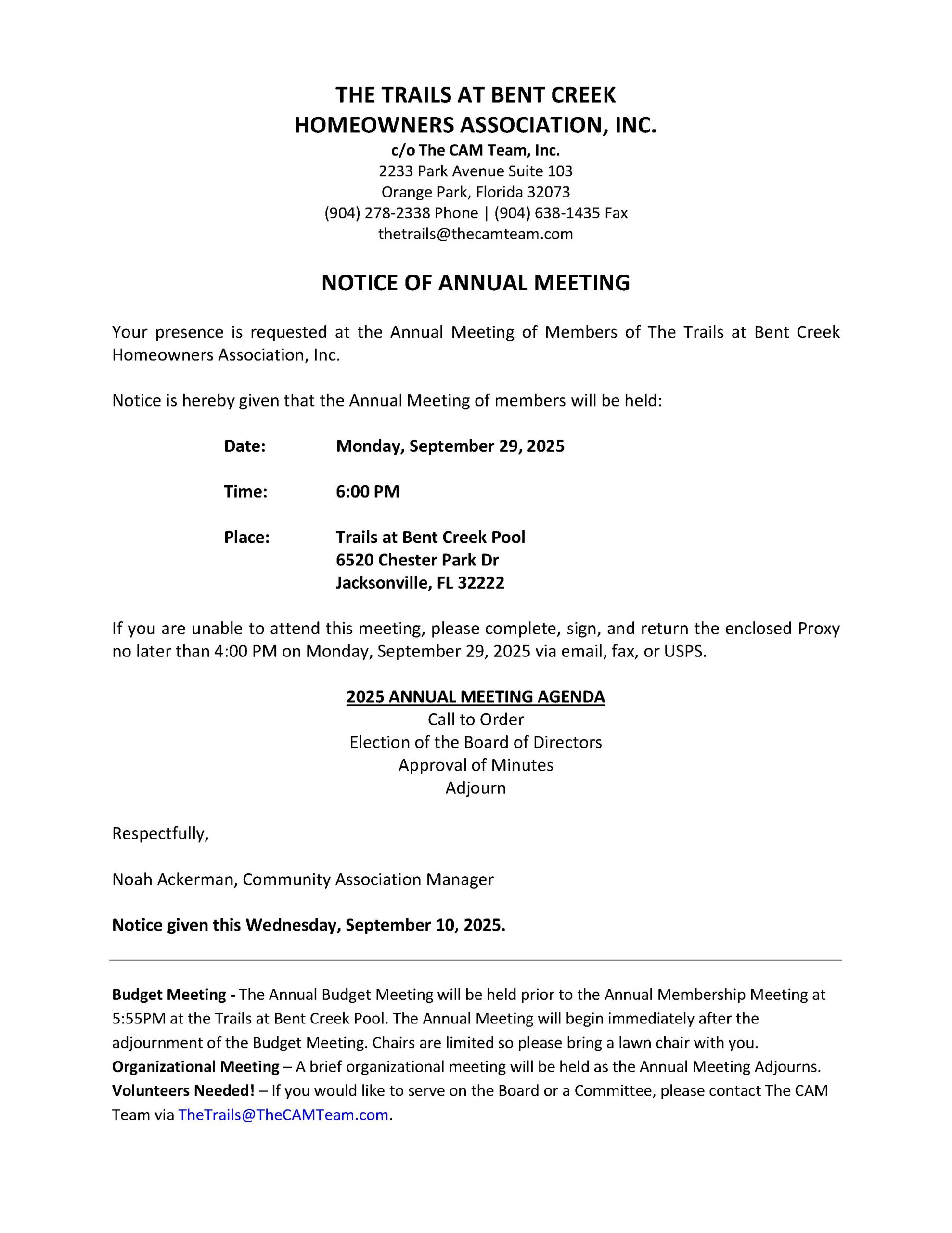 Annual/Budget Meeting September 27, 2024 at 6:00 p.m.